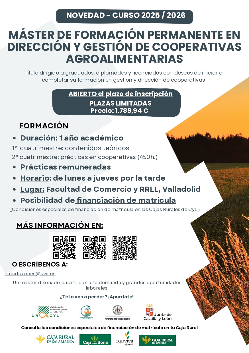 Tras el interés reciente del nuevo Máster de Formación Permanente en Dirección y Gestión de Cooperativas Agroalimentarias por parte de los estudiantes, se recuerda a todos los interesados que es posible la inscripción, aunque el TFG no se haya aún defendido, siempre que se haga antes de que finalicen estos estudios.