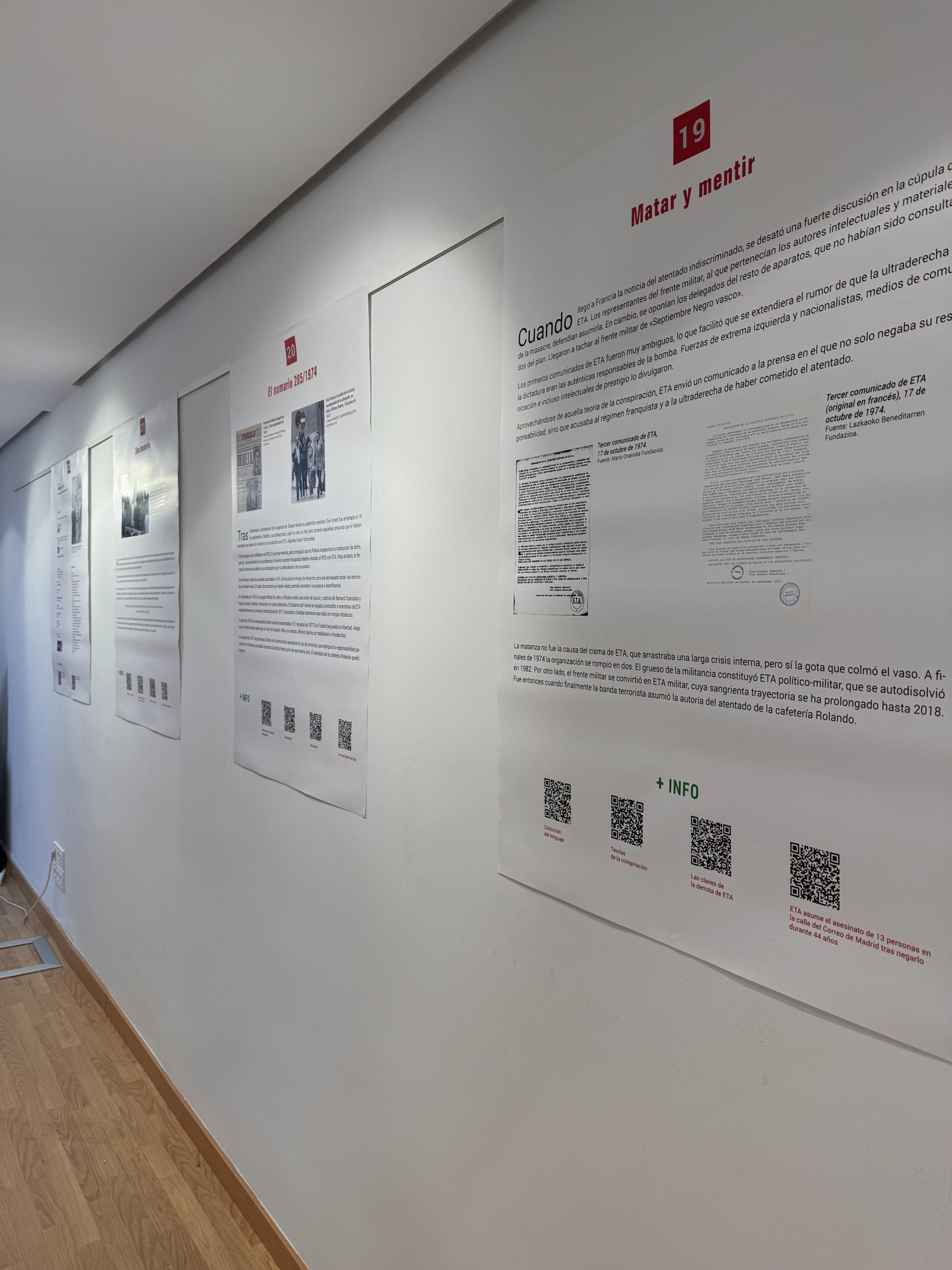 Esta exposición conmemora el 50º aniversario de la primera masacre de la banda terrorista ETA en Madrid. La capital de España fue la ciudad en la que más víctimas mortales causó la organización terrorista, y el atentado de la cafetería Rolando fue en el que más personas fueron asesinadas.